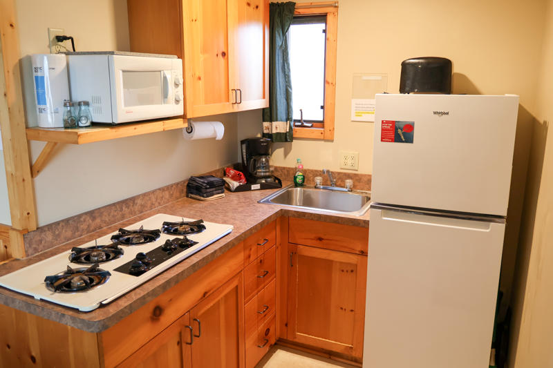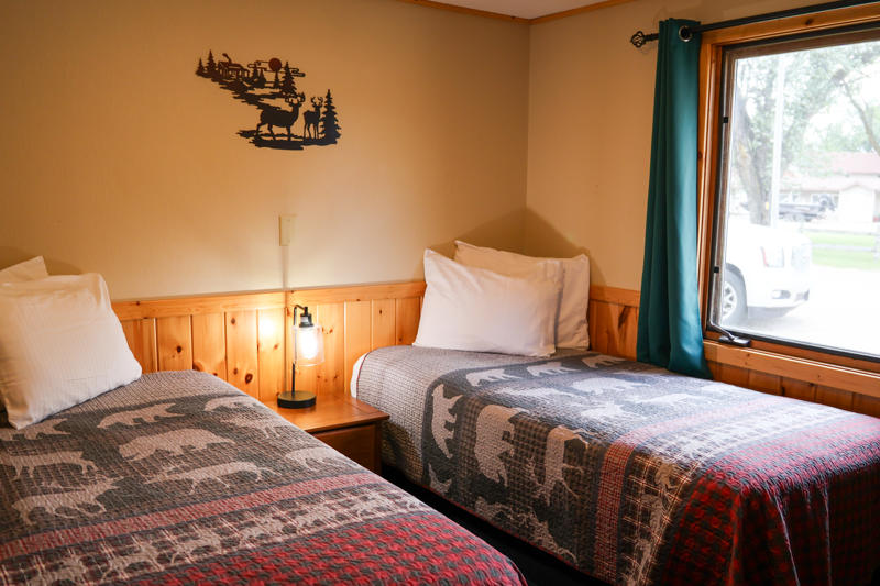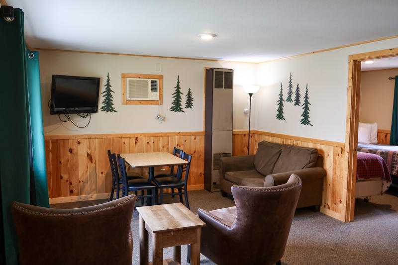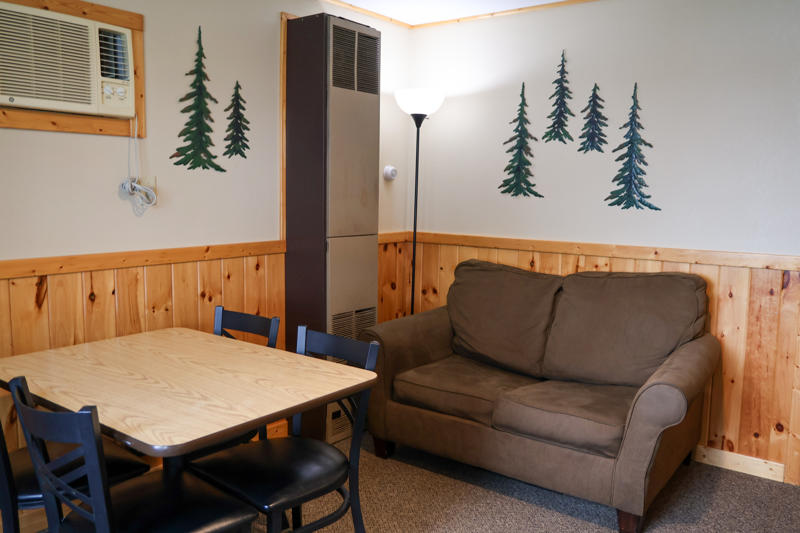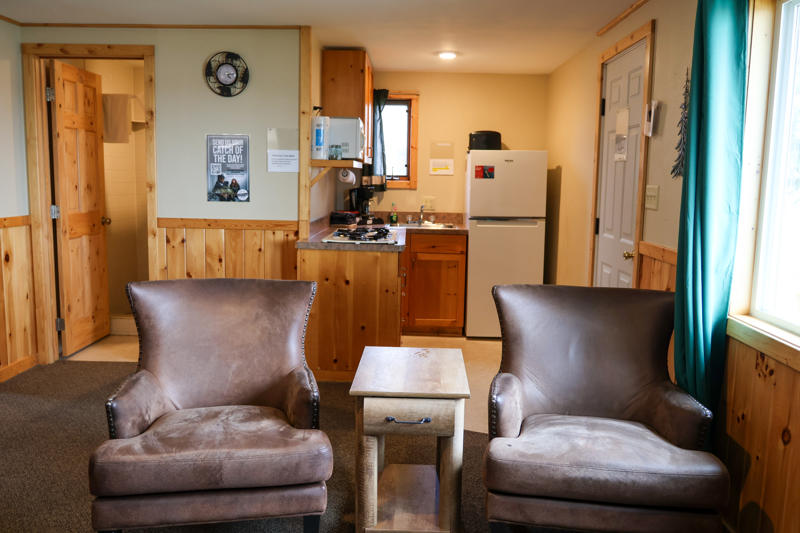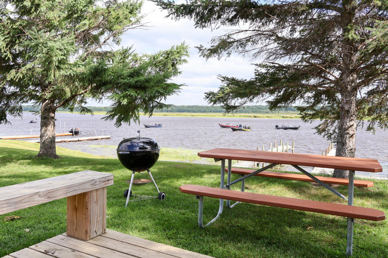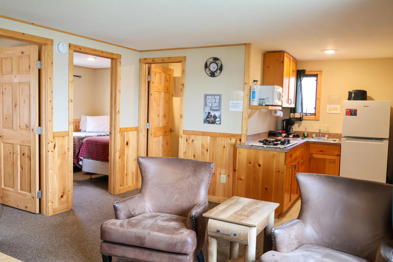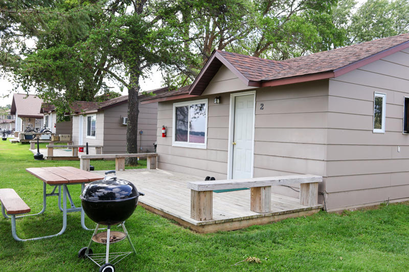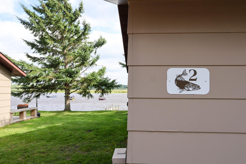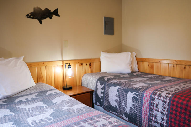 These cabins are original to the property from way back when it was a burbot fishery in the 1940s and 1950s. They’ve been updated and remodeled over the years and have two bedrooms with two twin beds each, plus a living area with a twin sofa sleeper. Watch the boats go by from the deck overlooking the beautiful Rainy River.